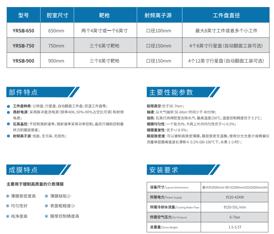 单片/多片进样室、工艺腔室、溅射系统、射频离子源辅助系统、真空系统、加热/冷却系统、气体传输系统、全自动程序控制系统等;