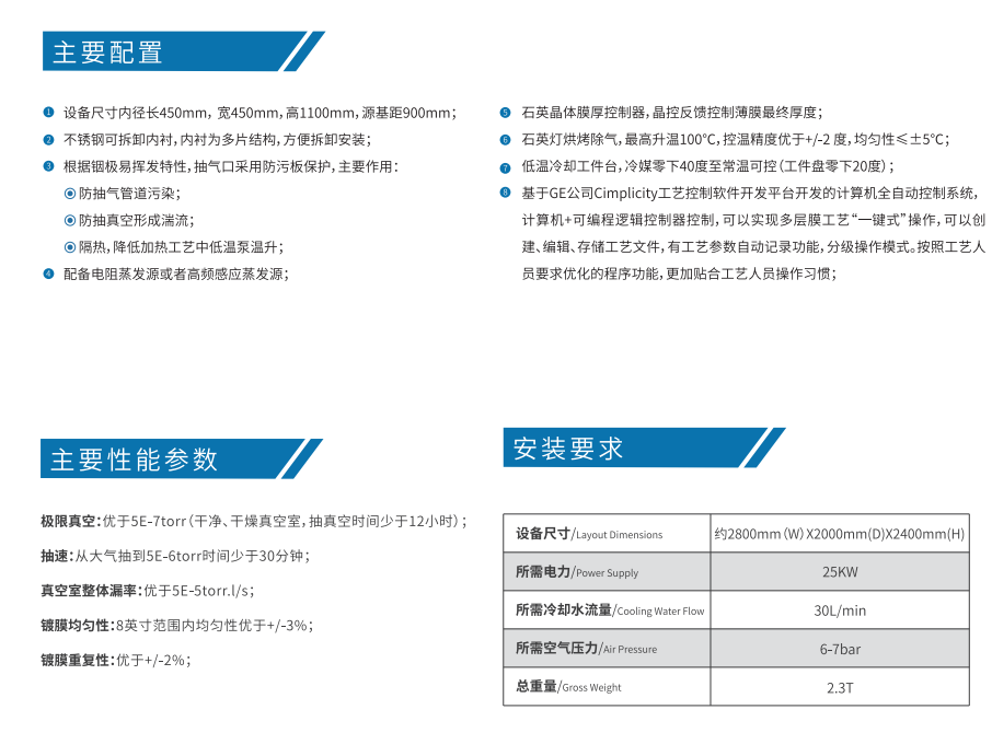 适用于在深宽比光刻胶图形的基片上生长铟柱,稳定可靠,自动化控制程度高,维护简单,可满足专业的铟柱沉积工艺需求。