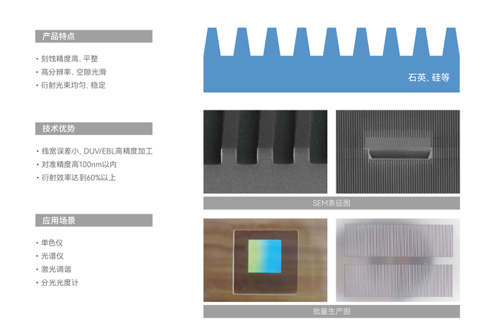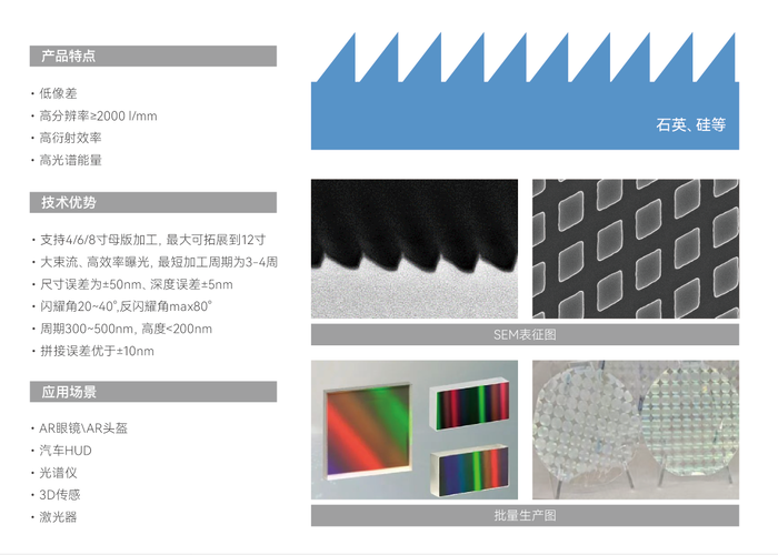 公司主要利用母版+压印来制作衍射光波导,掌握整套母版制造和纳米压印生产的工艺技术,精度可达到纳米级。