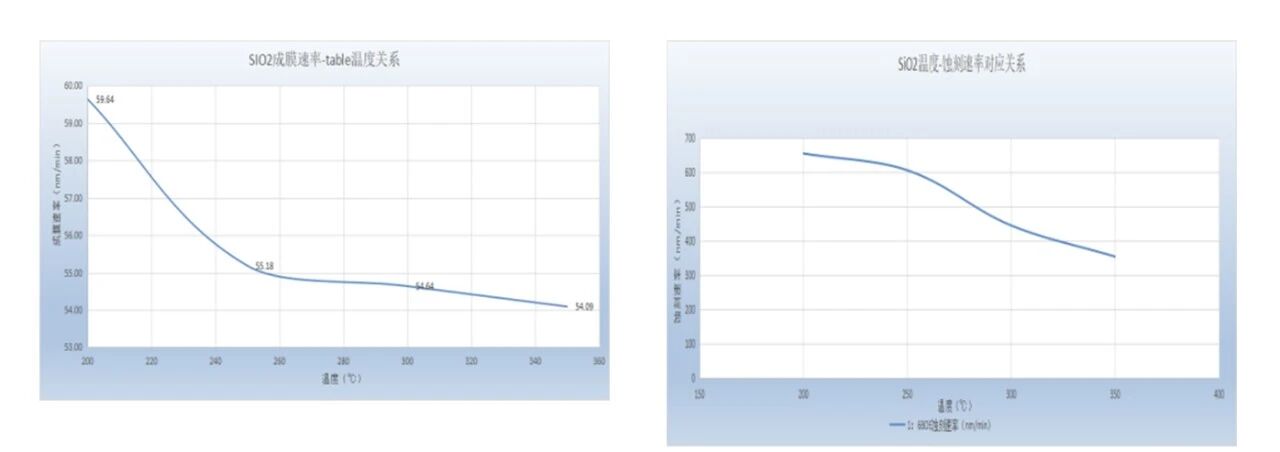 由以下图表可看出随着射频功率的增高,反应气体中活性离子能量增加,硅离子和氧离子结合更快,所以二氧化硅沉积速率变快;同时,生成的二氧化硅薄膜中氮氢含量更低,致密性更好,从图表中可看出致密性随射频功率提高而变好。