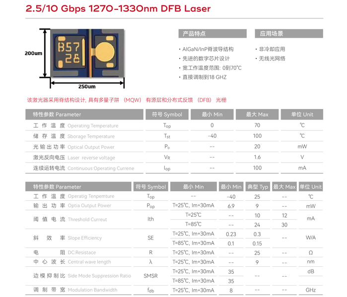 DFB:1270nm1290nm1310nm1330nm ,调制速率:2.5G 、10G、25G
